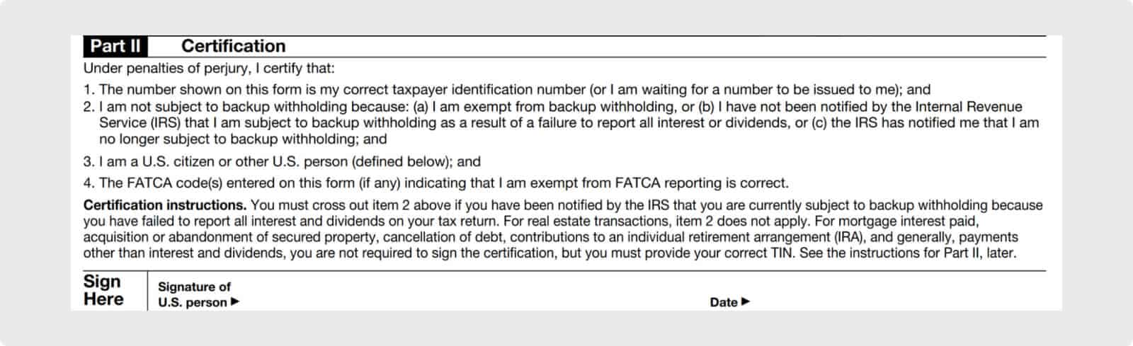 After completing Part I, the final step is to sign the W-9 in Part II as shown below: